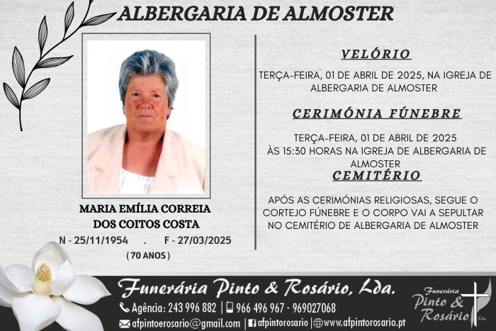 O funeral realiza-se terça-feira, 01 de abril de 2025, às 15:30 horas na Igreja de Albergaria de Almoster.