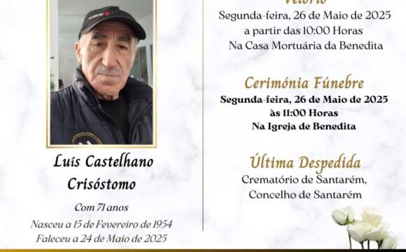 O funeral realiza-se segunda-feira, 06 de maio de 2024, às 10:00 horas, na Igreja de Arrouquelas.