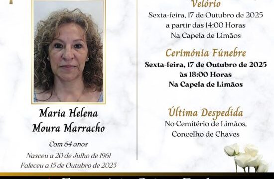 O funeral realiza-se terça-feira, 07 de janeiro de 2025, às 14:30 horas no Salão do Reino das Testemunhas de Jeová.