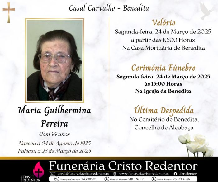 A cerimónia fúnebre realiza-se Segunda-feira, 24 de Março de 2025, às 15:00 horas, na Igreja de Benedita, seguindo para o Cemitério de Benedita, Concelho de Alcobaça.