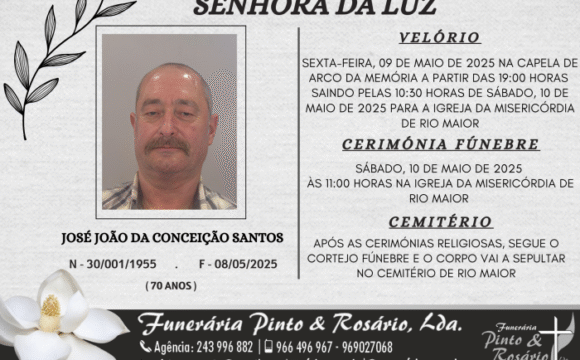 A cerimónia fúnebre realiza-se Segunda-feira, 01 de Julho de 2024, às 17:30 horas, na Igreja de Alcobertas, seguindo para o Cemitério de Alcobertas, Concelho de Rio Maior,