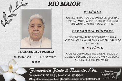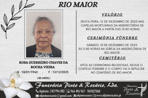 O funeral realiza-se sexta-feira, 13 de fevereiro de 2026, às 14:30 horas, na Igreja da Misericórdia de Rio Maior.