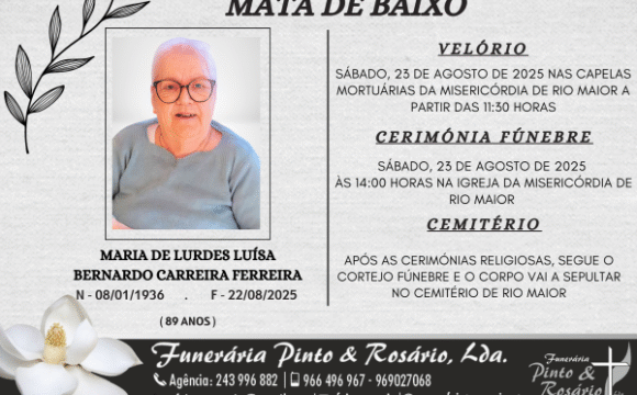 Pelas 15:30 horas sai para a Igreja de Outeiro da Cortiçada onde serão celebradas as cerimónias religiosas, findas as quais segue em cortejo fúnebre para o Cemitério de Outeiro da Cortiçada, onde irá a sepultar.