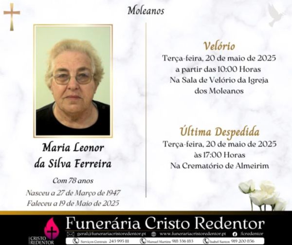 Faleceu no Lar Chão do Galego -Turquel a Sra. D. Maria Leonor da Silva Ferreira, com 78 anos.