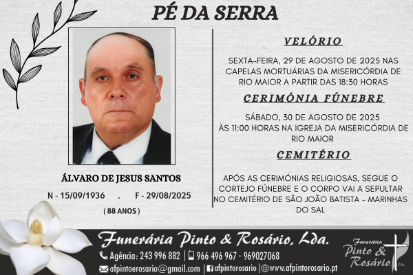 O funeral realiza-se sábado, 30 de agosto de 2025, às 11:00 horas, na Igreja da Misericórdia de Rio Maior.