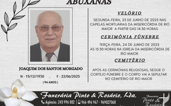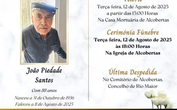 A cerimónia fúnebre realiza-se Quinta-feira, 28 de Novembro de 2024, às 10:30 horas, na Igreja de Alcobertas, seguindo para o Cemitério de Alcobertas, Concelho de Rio Maior.