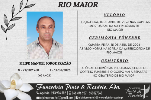 O funeral realiza-se quarta-feira, 15 de abril de 2026, às 15:00 horas, na Igreja da Misericórdia de Rio Maior.