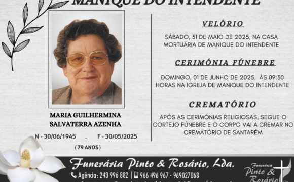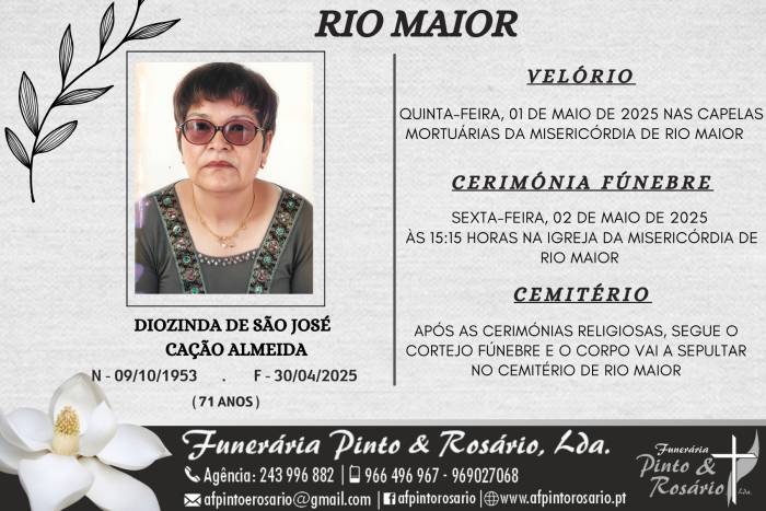 O funeral realiza-se sexta-feira, 02 de maio de 2025, às 15:15 horas, na Igreja da Misericórdia de Rio Maior.