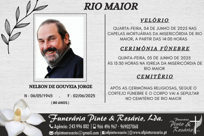 O corpo encontra-se em câmara ardente nas Capelas Mortuárias da Misericórdia de Rio Maior, a partir das 14:00 horas de quarta-feira, 04 de junho de 2025.