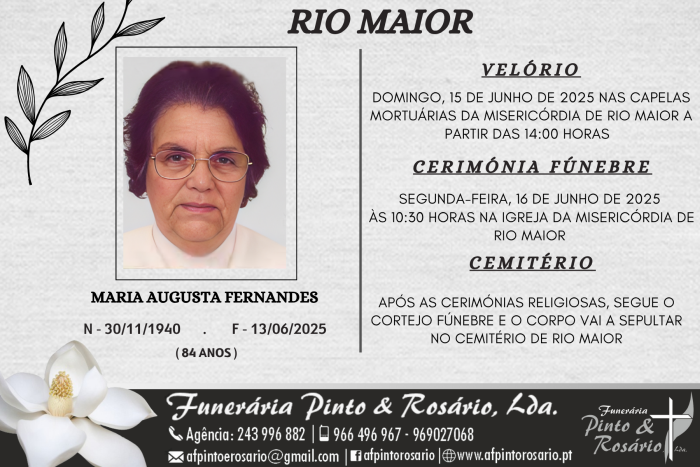 Faleceu no Hospital Distrital de Santarém a Exm.ª Senhora Maria Augusta Fernandes, com 84 anos.
