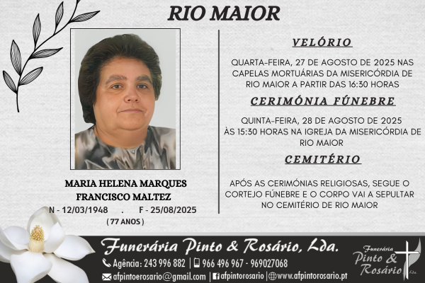 Faleceu na sua residência a Exm.ª Senhora Maria Helena Marques Francisco Maltez, com 77 anos.