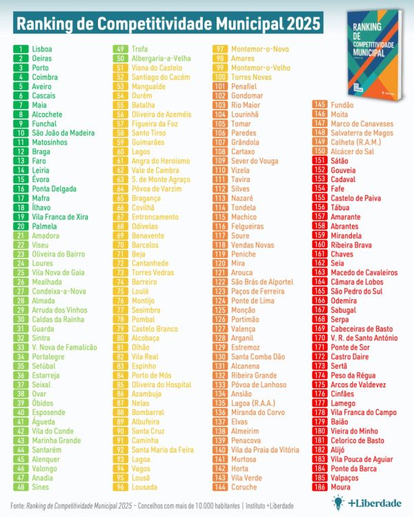 - Lisboa lidera com 70,1 pontos, seguida de Oeiras (66,2) e Porto (61,6). O top 10 é completo com Coimbra, Aveiro, Cascais, Maia, Alcochete, Funchal e São João da Madeira.