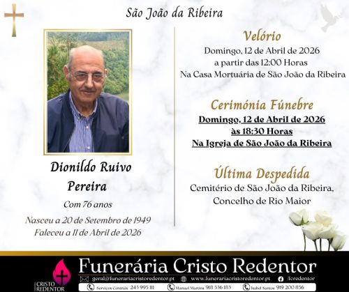 A cerimónia fúnebre realiza-se Domingo, 12 de Abril de 2026, às 18:30 horas, na Igreja de São João da Ribeira, seguindo para o Cemitério de São João da Ribeira, Concelho de Rio Maior.