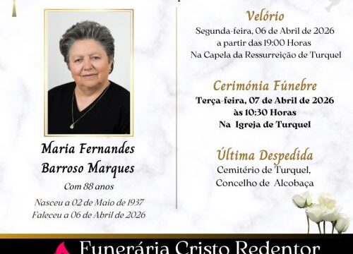 A cerimónia fúnebre realiza-se Sábado, 20 de Setembro de 2025, às 15:30 horas, na Igreja do Vimeiro, seguindo para o Cemitério de Vimeiro, Concelho de Alcobaça.